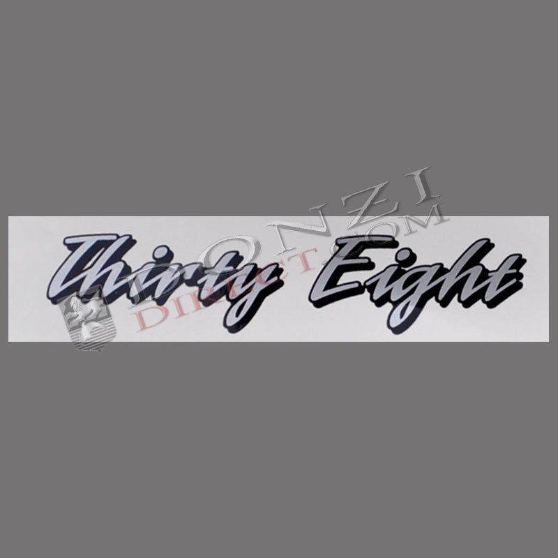 Single OEM designator decal for the 38 ZR. The "Thirty Eight" script is in brushed aluminum mylar and the drop shadow is printed in black, with UV protective overlay.