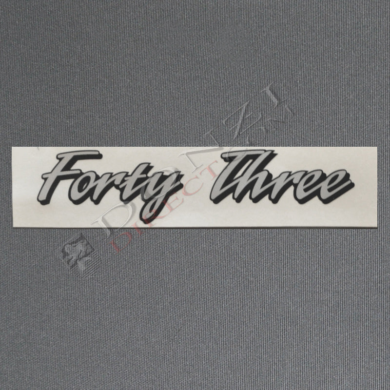 Single OEM designator decal for the 43 ZR. The "Forty Three" is in brushed aluminum mylar and the drop shadow is printed in black, with UV protective overlay.