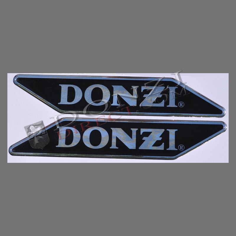 Raised "DONZI" logo parallelograms, used on 1980s Donzi GT and Ragazza R-series runabouts. Reproduced due to customer demand, we have recreated this logo in the original size and shape, to replace the original badges which typically fade (or fall off) over time. These new decals are raised, with the metallic chrome and black "DONZI" logo protected under a deep layer of flexible clear. Each logo measures approx 9 3/4" x 1 13/16". Sold as a set, with one forward-sweeping logo for each side of the boat. Self adhesive with easy peel-and-stick application, they have been designed to provide long-lasting good looks.
