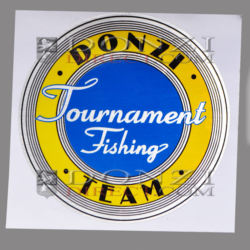 One "Donzi Tournament Fishing Team" OEM hullside logo from the 1980s. This round 6" badge was used on Donzi F-series center console fishing boats. Brushed aluminum finish with yellow, blue, and black thermal print overlay.