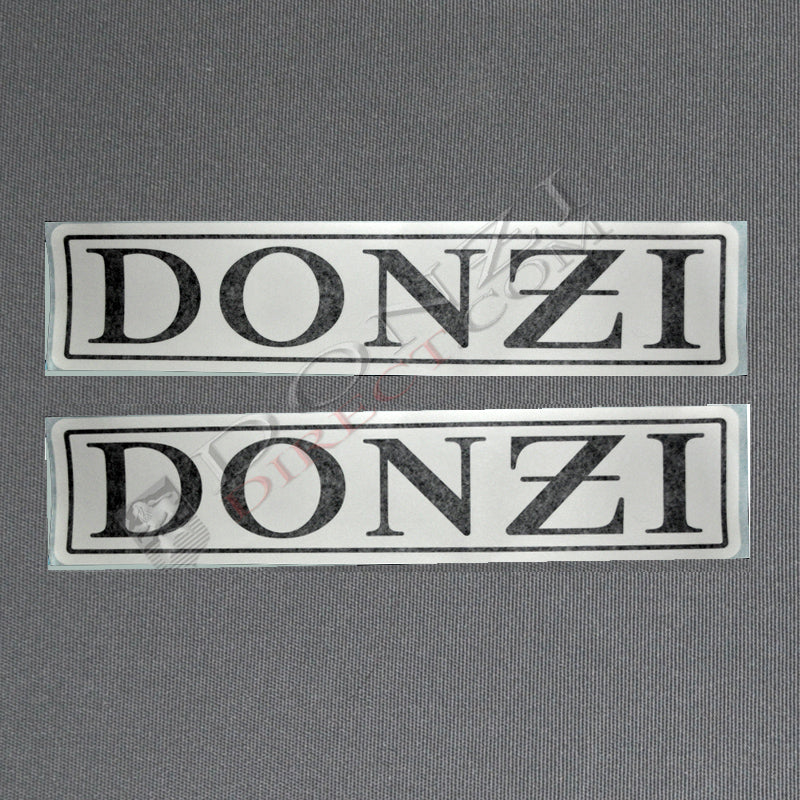 One pair of black and white DONZI rectangle logos. Used on many 1960s & 1970s Donzi models. This logo was used with many different flags (lion/dolphin, USA, British, Corsican, Canada, etc.)