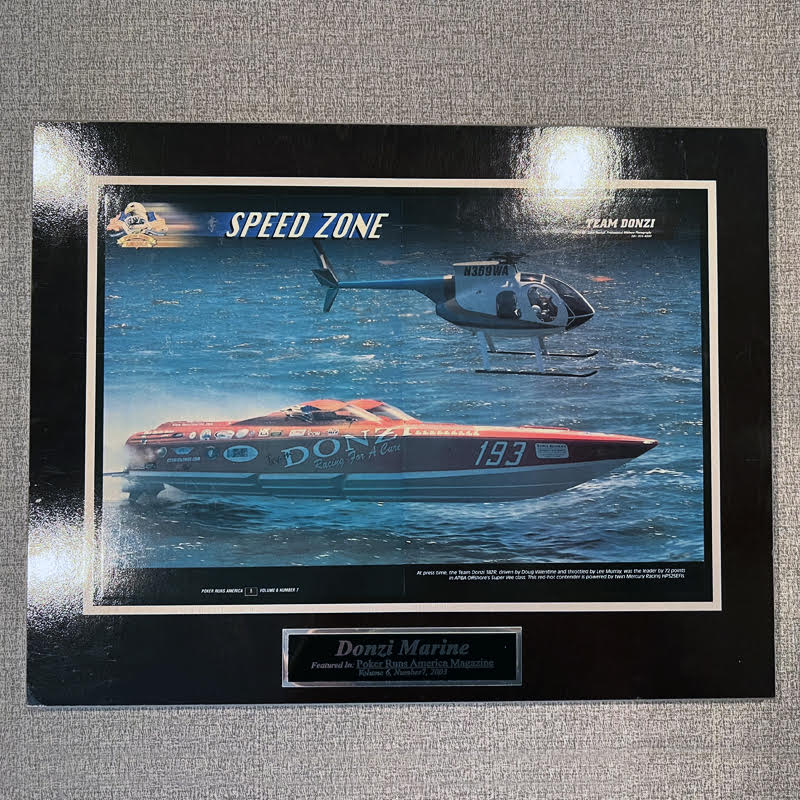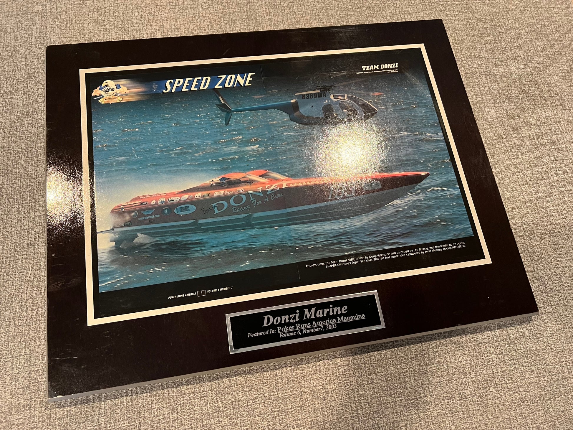 2003 APBA Super Vee National Champion 38 ZRC photo spread from Poker Runs America Magazine, reprinted as hard-backed wall art with commemorative plaque. From the conference room at Donzi’s Sarasota, Florida factory, from 2003 to circa 2011.