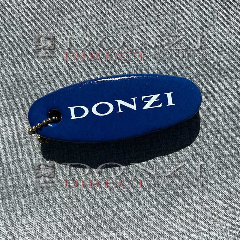 Rugged vinyl dipped floating keychain featuring the Donzi Logo in white. Perfect condition, original dealer stock. Made from sealed, vinyl coated closed cell foam. Approximately 4" long. Includes brass, ball-bearing keychain. Limited quantities remain.