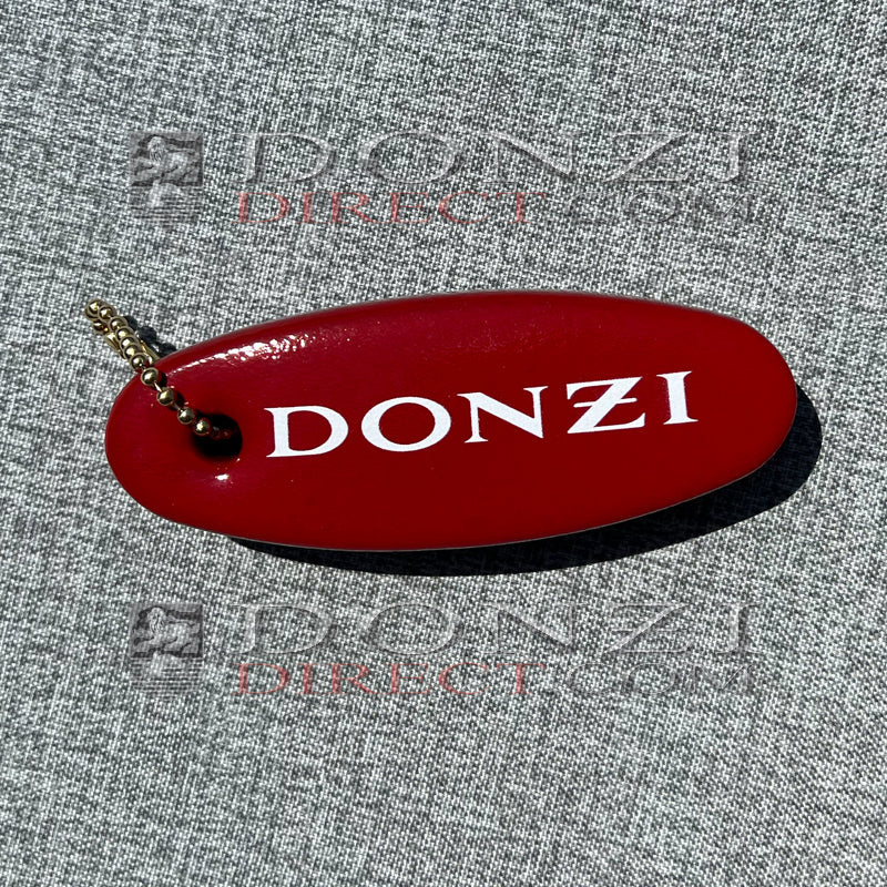 Rugged vinyl dipped floating keychain featuring the Donzi Logo in white. Perfect condition, original dealer stock. Made from sealed, vinyl coated closed cell foam. Approximately 4" long. Includes brass, ball-bearing keychain. Limited quantities remain.