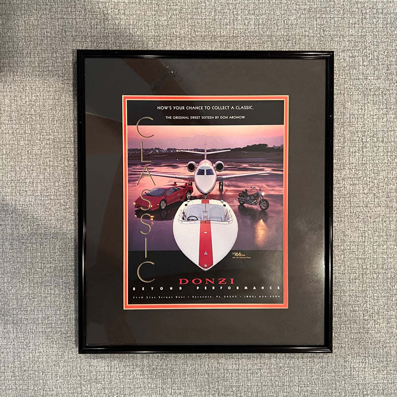 Donzi print ad from 1998, framed and hung as wall art in Donzi parent company American Marine Holdings (AMH)’s Sarasota, Florida headquarters.