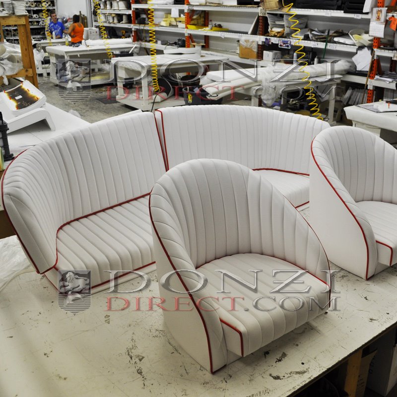 Each individual piece of Donzi upholstery is built by professionals using the most durable marine-grade materials available. Each piece of vinyl on every Donzi OEM Classic upholstery component is cut on a Gerber digital cutter from computerized patterns. This guarantees precise tolerances and perfect fit. Vinyl strips are then sewn together in genuine “tuck & roll” style using marine-grade thread that is UV resistant and far more durable than automotive thread used by most shops. The “tuck & roll” is then sewn onto P55 poly channeling foam. Inside, you’ll find P240 high density closed-cell foam. One of the most resilient and durable (and accordingly, expensive) seating foams in the industry. All removable cushions are backed with breathable mesh material with zipper.