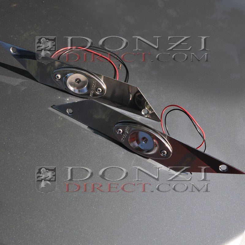 A DonziDirect.com exclusive! Upgrade the faded, incandescent nav lights of your Donzi 27 ZR, 35 ZR, 38 ZR, 38 ZRC, and 43 ZR with these new LED light kits! A polished, mirror-finish stainless steel mounting plate replaces the glued-in green and red plex lenses and allows for the mounting of Coast Guard-approved red/green LED navigation lights with two mile visibility rating. This kit includes one pair of LED nav lights, and port & starboard ZR mounting plates.