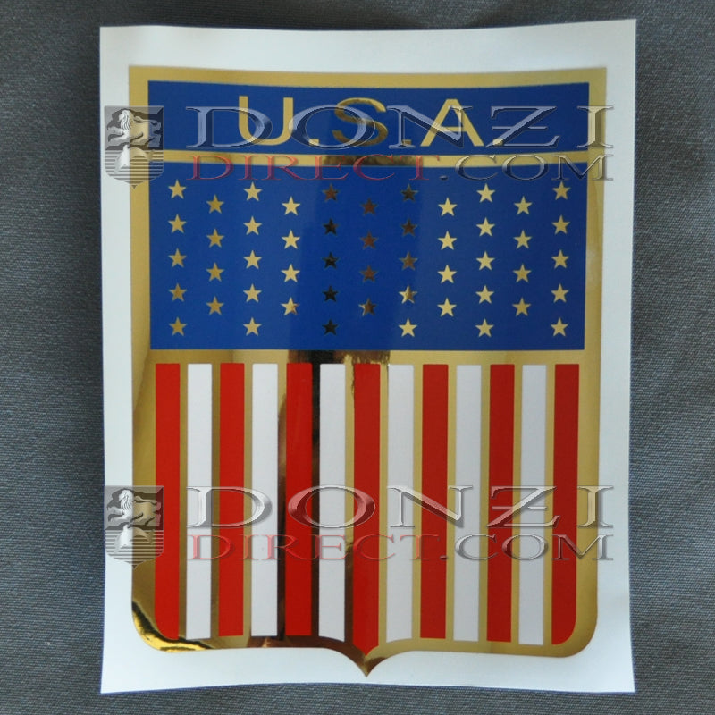 One Donzi "USA" flag decal in original 1960's/70's style. Gold with red, white, and blue. This flag is 6 3/4" tall by 5 1/2" wide to fit vintage Donzi models.